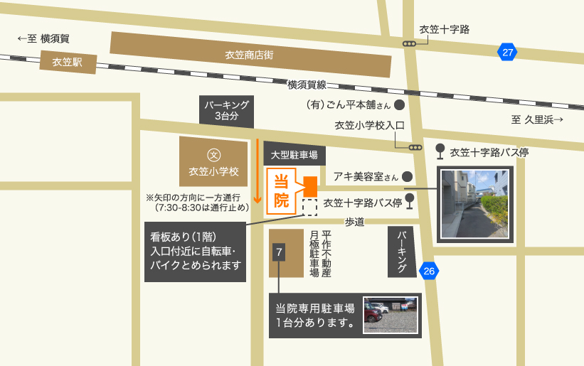 ☆当院専用駐車場が1台分ございますが、空いていない場合は当院を正面に見て右側(衣笠小学校入口)から入って100m少し直進し、左手に衣笠小を見て右手にパーキング(3台分)がありますのでご利用下さい。駐車料金は当院が領収書と引き換えに負担します。